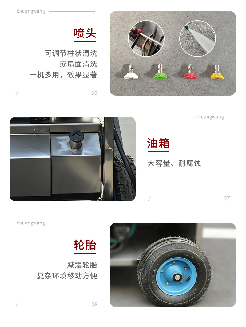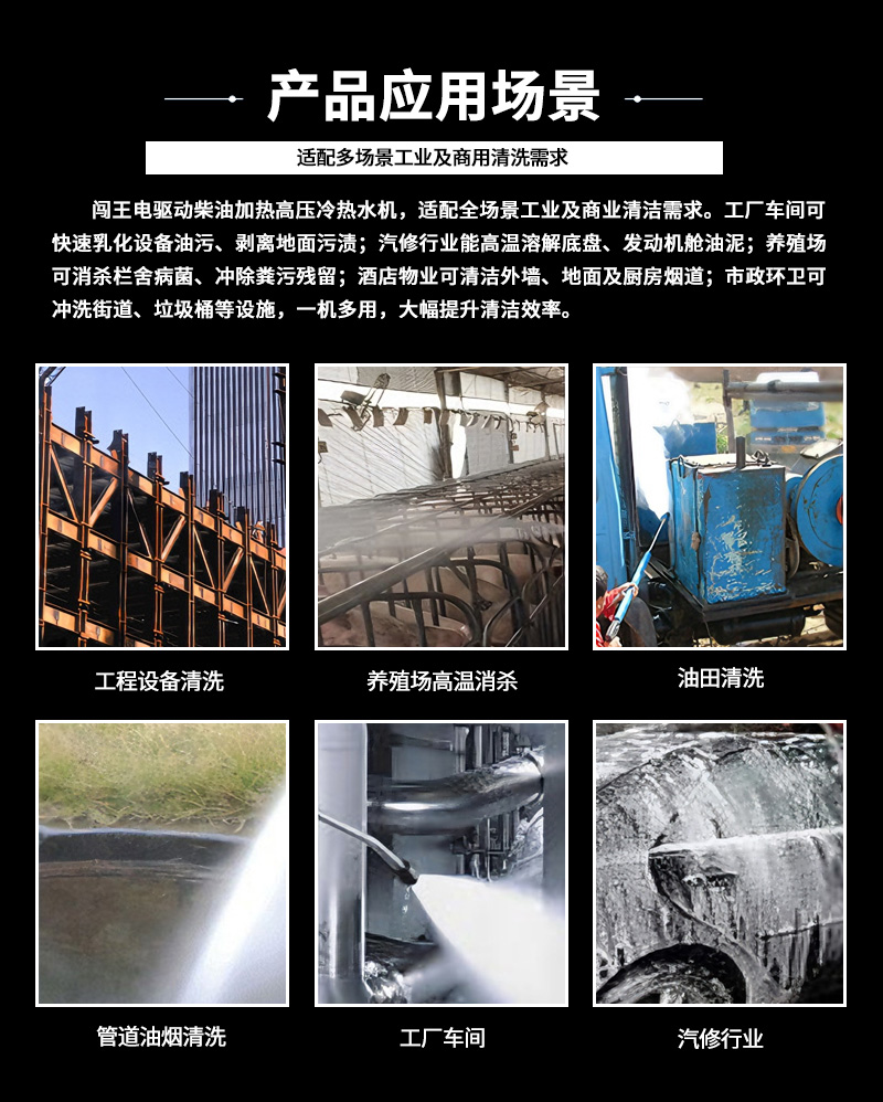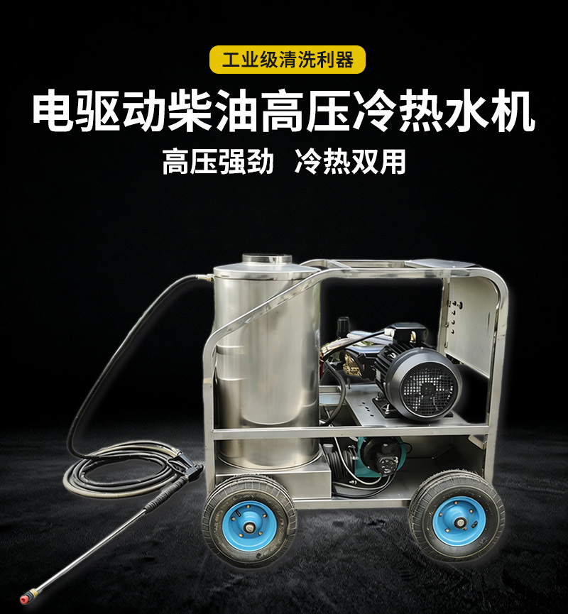 本款電驅(qū)動(dòng)柴油加熱高壓冷熱水清洗機(jī),電驅(qū)動(dòng)動(dòng)力強(qiáng)勁,柴油快速加熱,冷水高壓沖洗、高溫?zé)崴?,高效去除重油污、油垢、頑固污漬。適用于工廠車間、機(jī)械設(shè)備、汽修廠、養(yǎng)殖場(chǎng)、工程車輛、管道等工業(yè)及商用清潔,耐用穩(wěn)定、移動(dòng)方便、清潔效率高。